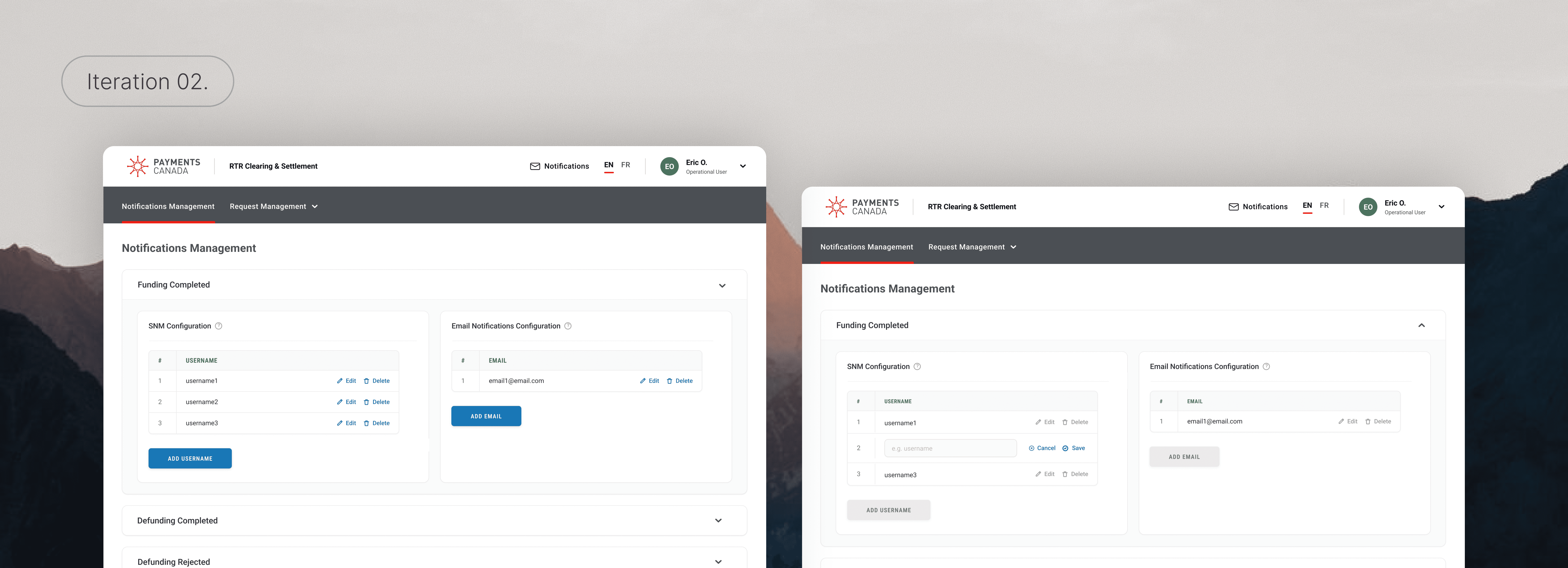 Our subsequent iteration organized notification event types within an accordion layout, allowing individual email addresses and usernames to be edited or removed per notification event