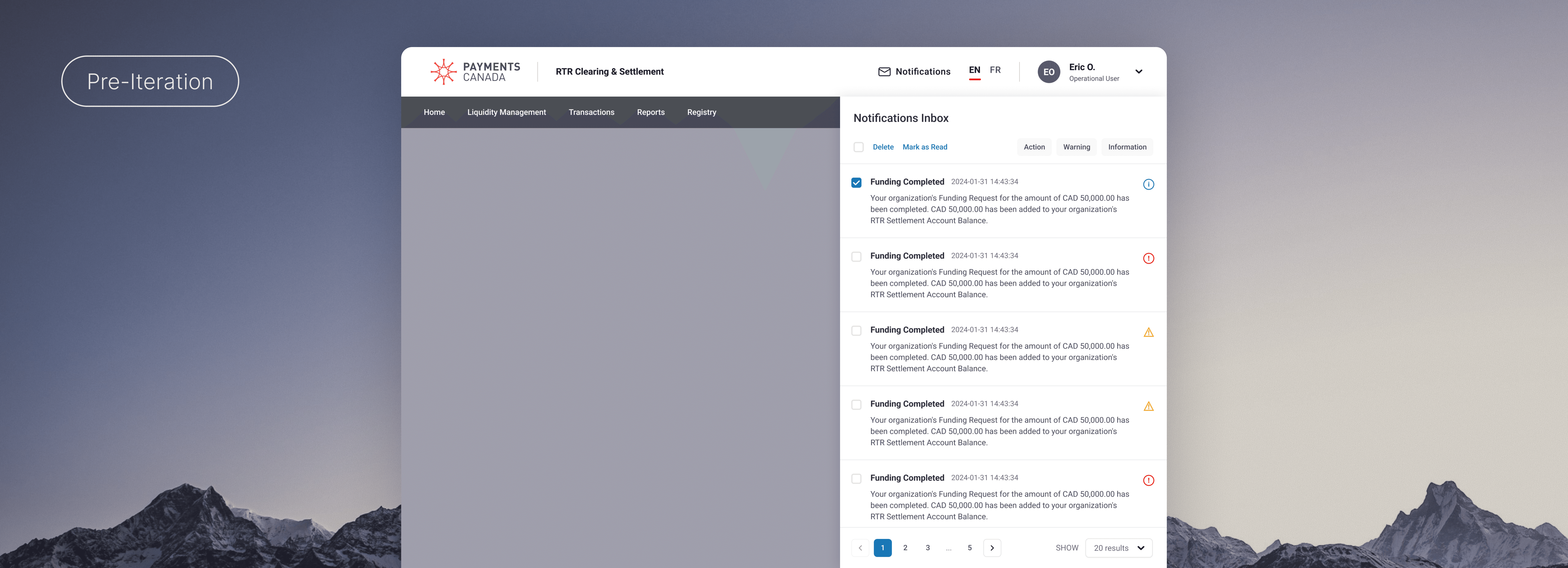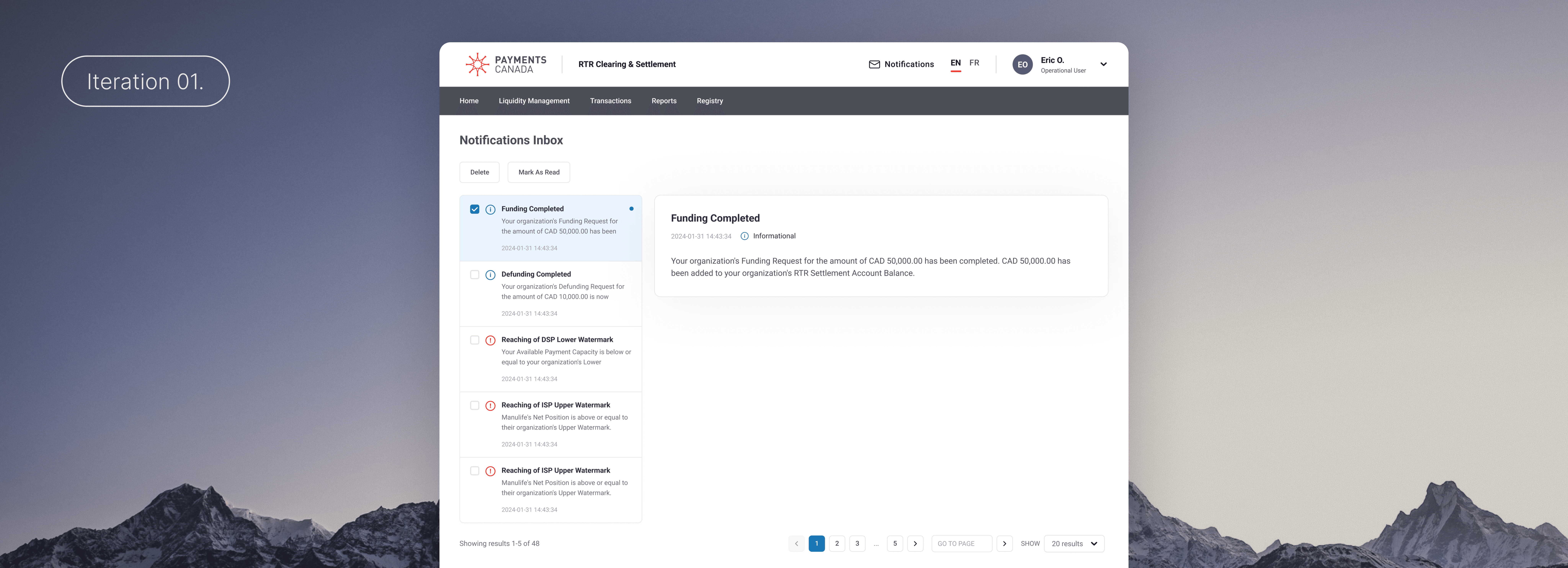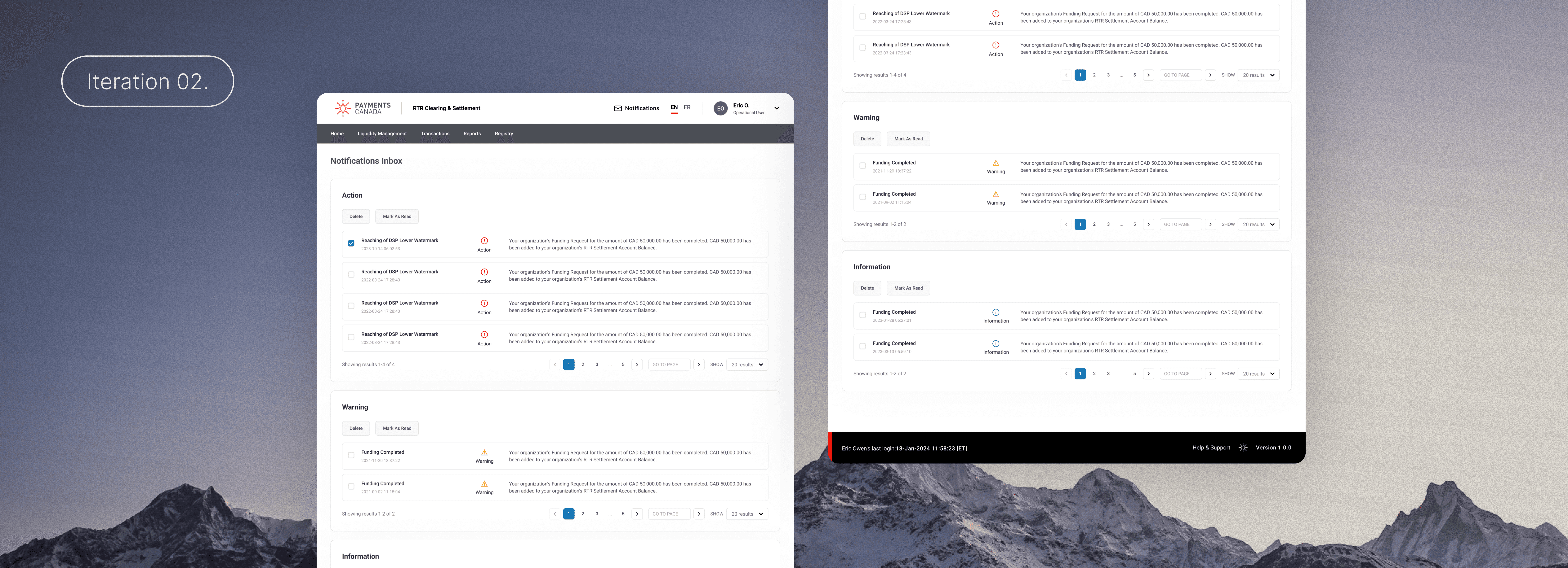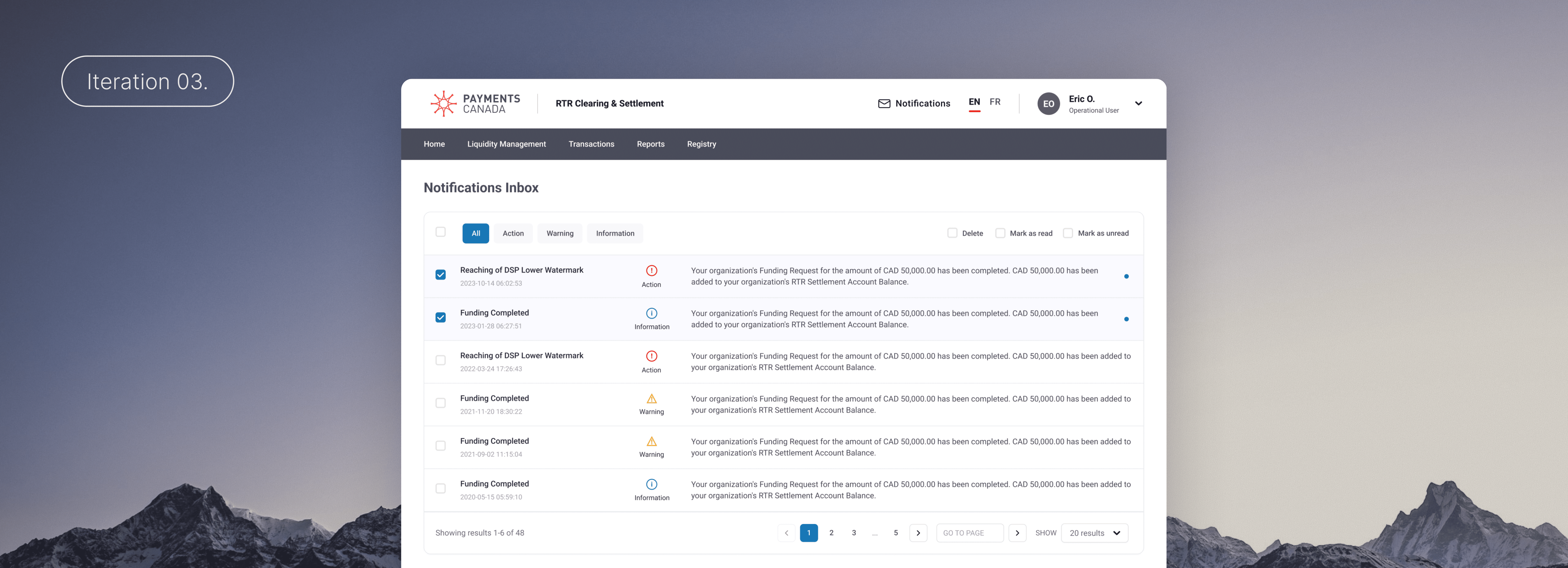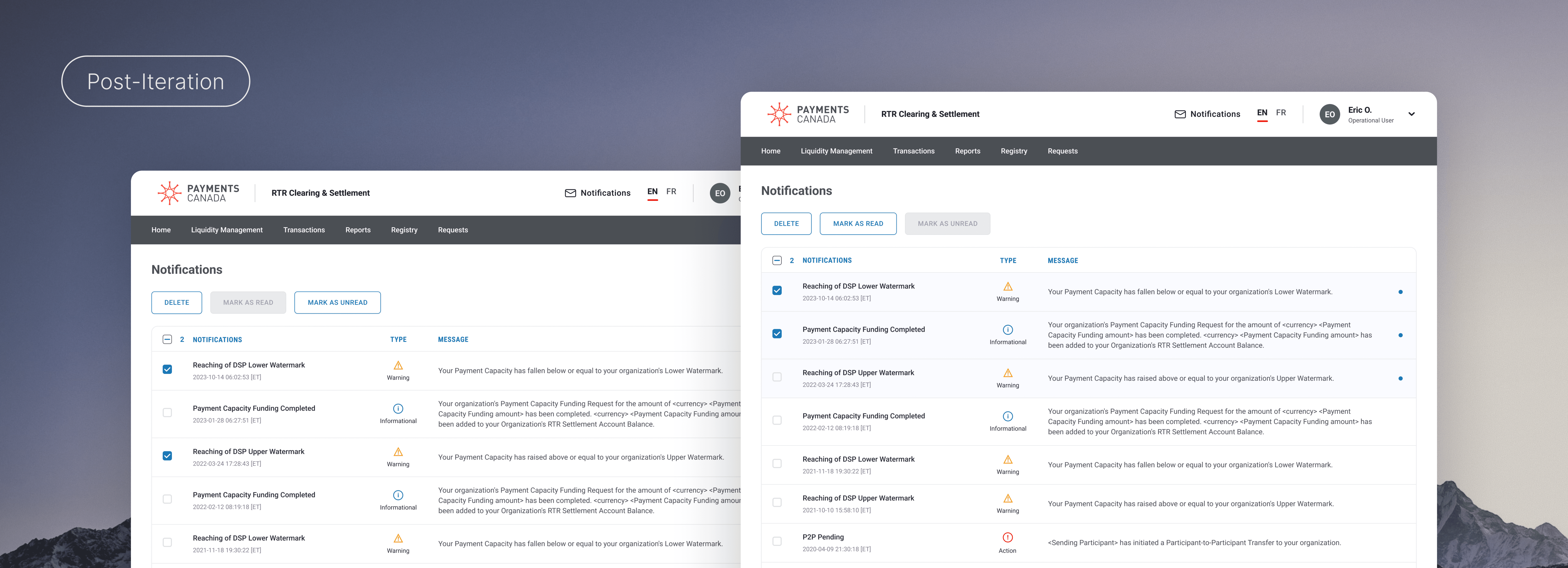 Our final iteration consolidated notifications into a single table, with message types clearly distinguished through a combination of icons and text labels. The required primary actions - 'Delete', 'Mark as read', and 'Mark as unread '- were all surfaced as prominent buttons instead of text links to improve visibility and ease of interaction