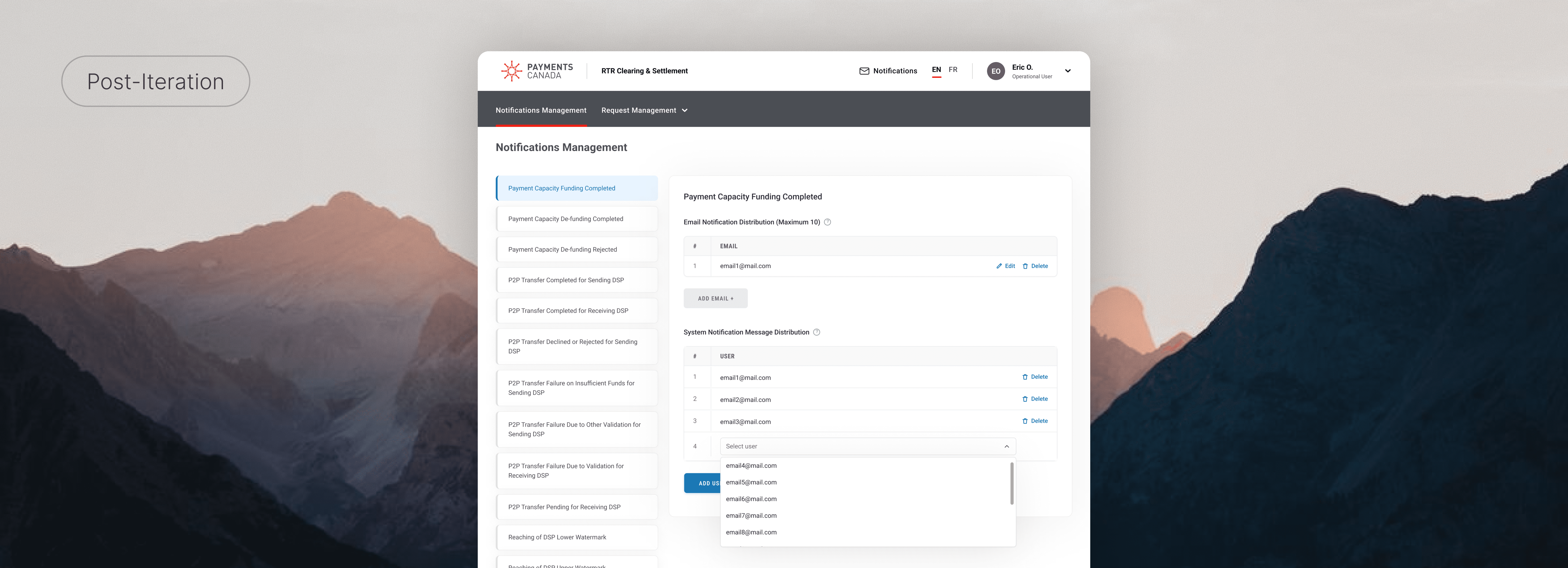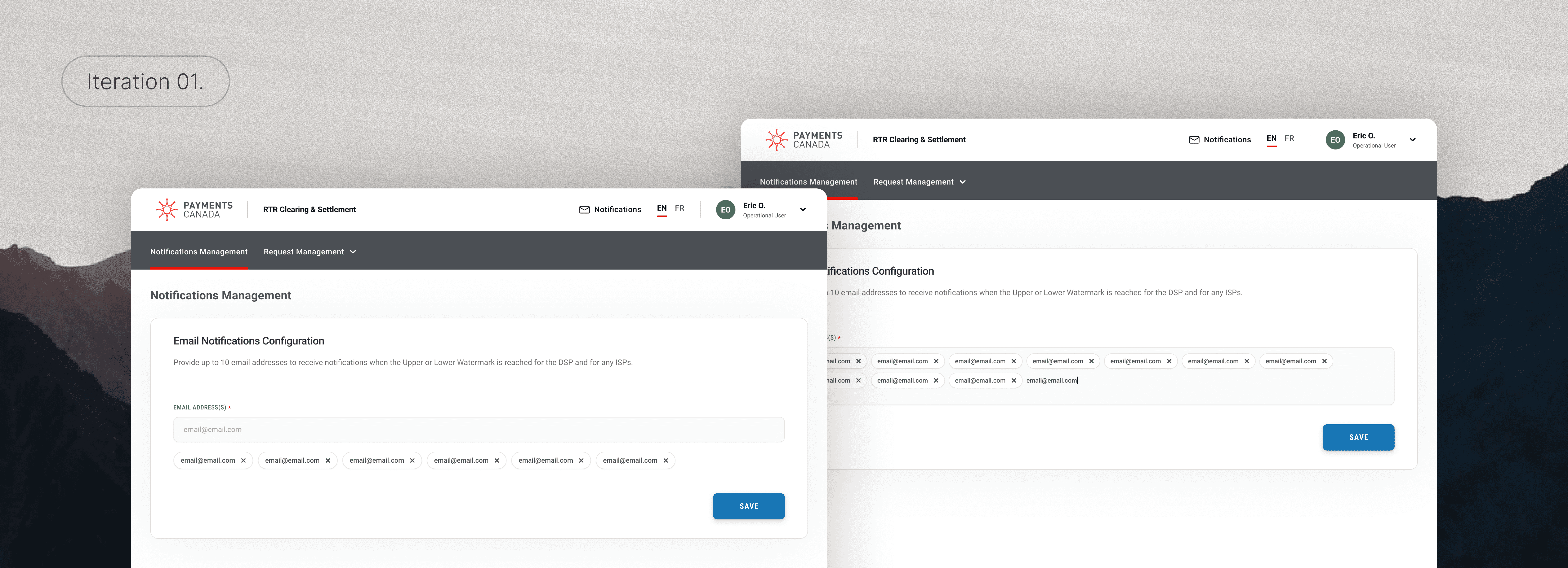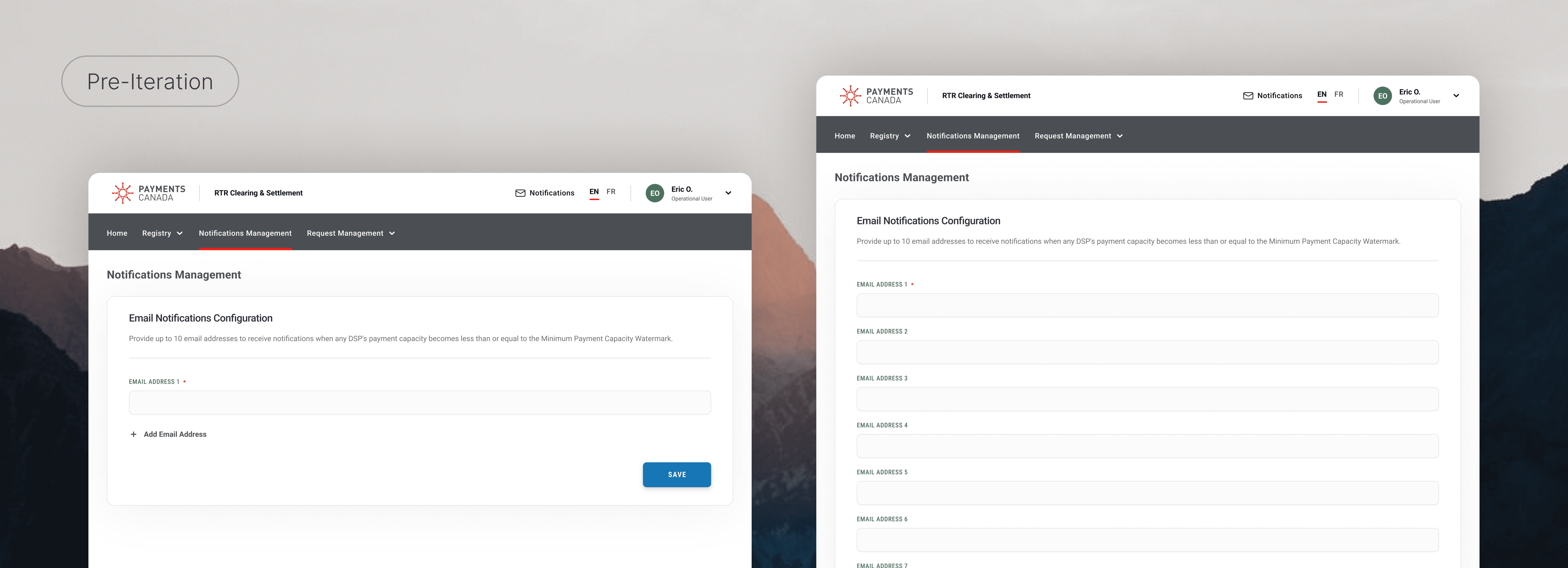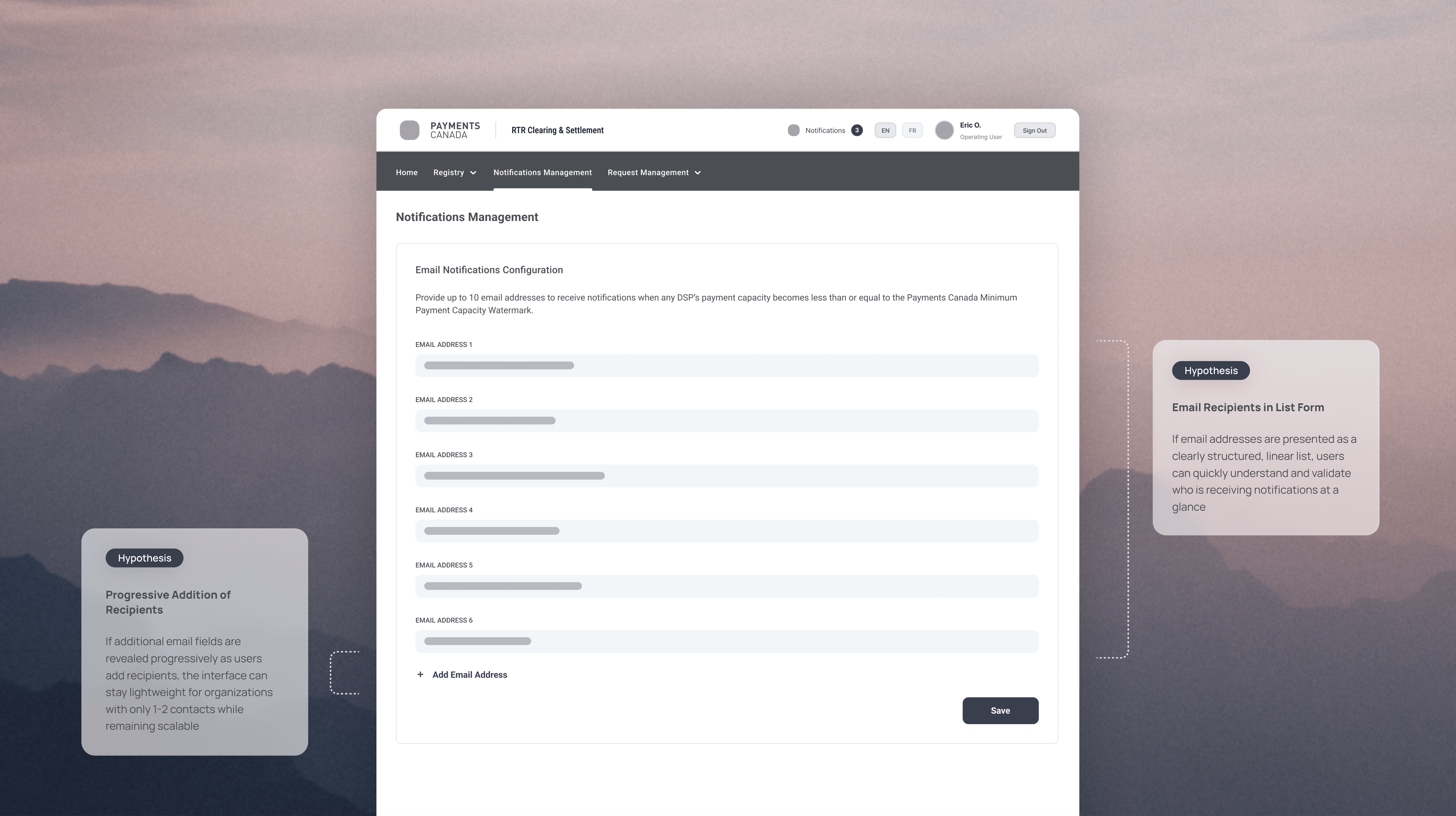The business requirements for Notifications Configuration established clear constraints: notifications are managed at the Organization level, delivered via email, and limited to a maximum of 10 addresses per list, with no validation enforced on input. While the rules defined system behavior, the interaction model for managing and maintaining these lists was open to interpretation.